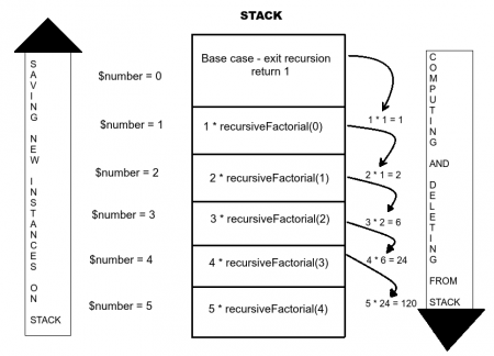 The returning of 1 wakes up the last created instance of the function on stack (the one that called It – $number = 1), which accepts the return value of 1 and uses it to compute 1 * recursiveFactorial(1-1). This returns 1, the called instance is being deleted from stack and the next instance on stack is being called ($number = 2). After computing 2 * recursiveFactorial(2-1), 2 is returned, the called instance is being deleted from stack and next instance on stack is being called. The process continues until the “oldest” instance of function (the first one to be stored on stack, $number = 5) is computed and the final value of 120 returned.